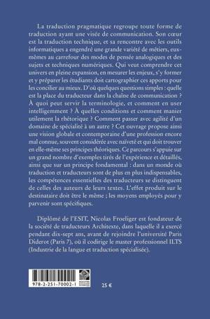 English summary: The advent of technological tools, and especially digital technologies, has had profound effects on the world of translation, and has led to a series of questions addressed in the present volume: what is the role of the translator in a chain of communication? What is technology and how can it be used intelligently? How does one pass from one field of specialization to another? This work proposes a global and contemporary vision of a profession still poorly understood, and centers on the idea that the essential competences of translators are different from those of the authors of their texts. French description: La traduction pragmatique regroupe toute forme de traduction ayant une visee de communication. Son coeur est la traduction technique, et sa rencontre avec les outils informatiques a engendre une grande variete de metiers, eux-memes au carrefour des modes de pensee analogiques et des sujets et techniques numeriques. Qui veut comprendre cet univers en pleine expansion, en mesurer les enjeux, s'y former et y preparer les etudiants doit cartographier ces apports pour les concilier au mieux. D'ou quelques questions simples: quelle est la place du traducteur dans la chaine de communication ? A quoi peut servir la terminologie, et comment en user intelligemment ? A quelles conditions et comment manier utilement la rhetorique ? Comment passer avec agilite d'un domaine de specialite a un autre ? Cet ouvrage propose ainsi une vision globale et contemporaine d'une profession encore mal connue, souvent consideree avec naivete et qui doit trouver en elle-meme ses principes theoriques. Ce parcours s'appuie sur un grand nombre d'exemples tires de l'experience et detailles, ainsi que sur un principe fondamental: dans un monde ou traduction et traducteurs sont de plus en plus indispensables, les competences essentielles des traducteurs se distinguent de celles des auteurs de leurs textes. L'effet produit sur le destinataire doit etre le meme; les moyens employes pour y parvenir sont specifiques.