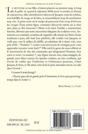 « La métayère et ses filles s'étaient placées au premier rang, le long de la grille. Et, quand le régiment défila pour se rendre au champ de manoeuvres, elles cherchèrent à découvrir Jacques. Mais les soldats, tout habillés de rouge et de bleu, se ressemblaient trop, ils marchaient trop vite. À peine avait-on le temps de parcourir d'un coup d'oeil tous les visages d'une même ligne. Comment découvrir même un si cher ami, dans ce flot mouvant ? Marie et la mère Noellet y renoncèrent bientôt, éblouies par cette succession fatigante de couleurs vives. Antoinette, au contraire, continua de regarder. Elle aimait ses frères d'une tendresse à part, elle était leur préférée, elle voulait voir Jacques. Et voilà que, vers le milieu du défilé, un adjudant dit à demi voix, tout près d'elle : Numéro 7, voulez-vous trois jours de consigne pour vous apprendre à porter votre fusil ? Elle suivit le geste du sous-officier et le mouvement de tête des camarades qui désignaient l'homme. Son coeur se serra. »