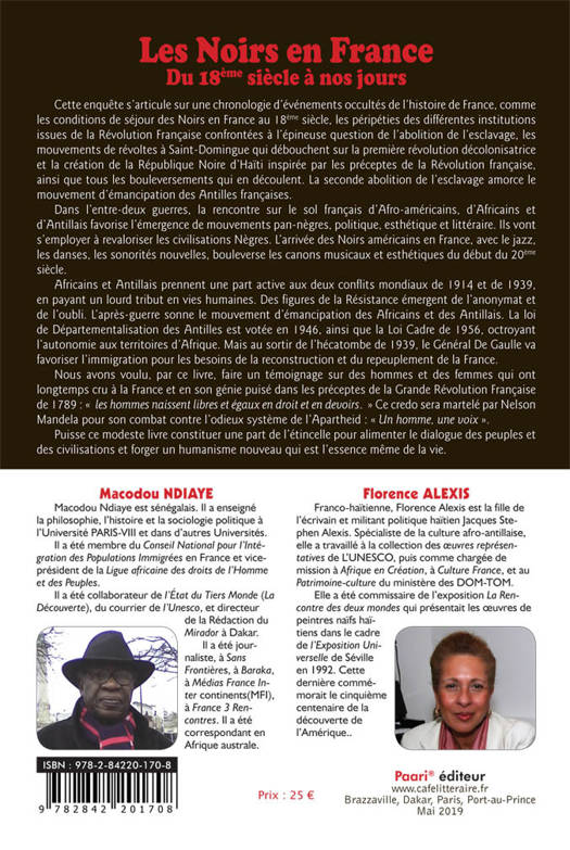 Les Noirs en France du 18ème siècle à nos jours Cette enquête s’articule sur une chronologie d’événements occultés de l’histoire de France, comme les conditions de séjour des Noirs en France au 18ème siècle, les péripéties des différentes institutions issues de la Révolution Française confrontées à l’épineuse question de l’abolition de l’esclavage, les mouvements de révoltes à Saint-Domingue qui débouchent sur la première révolution décolonisatrice et la création de la République Noire d’Haïti inspirée par les préceptes de la Révolution française, ainsi que tous les bouleversements qui en découlent. La seconde abolition de l’esclavage amorce le mouvement d’émancipation des Antilles françaises. Dans l’entre-deux guerres, la rencontre sur le sol français d’Afro-américains, d’Africains et d’Antillais favorise l’émergence de mouvements pan-nègres, politique, esthétique et littéraire. Ils vont s’employer à revaloriser les civilisations Nègres. L’arrivée des Noirs américains en France, avec le jazz, les danses, les sonorités nouvelles, bouleverse les canons musicaux et esthétiques du début du 20ème siècle. Africains et Antillais prennent une part active aux deux conflits mondiaux de 1914 et de 1939, en payant un lourd tribut en vies humaines. Des figures de la Résistance émergent de l’anonymat et de l’oubli. L’après-guerre sonne le mouvement d’émancipation des Africains et des Antillais. La loi de Départementalisation des Antilles est votée en 1946, ainsi que la Loi Cadre de 1956, octroyant l’autonomie aux territoires d’Afrique. Mais au sortir de l’hécatombe de 1939, le Général De Gaulle va favoriser l’immigration pour les besoins de la reconstruction et du repeuplement de la France. Nous avons voulu, par ce livre, faire un témoignage sur des hommes et des femmes qui ont longtemps cru à la France et en son génie puisé dans les préceptes de la Grande Révolution Française de 1789 : « les hommes naissent libres et égaux en droit et en devoirs. » Ce credo sera martelé par Nelson Mandela pour son combat contre l’odieux système de l’Apartheid : « Un homme, une voix ». Puisse ce modeste livre constituer une part de l’étincelle pour alimenter le dialogue des peuples et des civilisations et forger un humanisme nouveau qui est l’essence même de la vie.