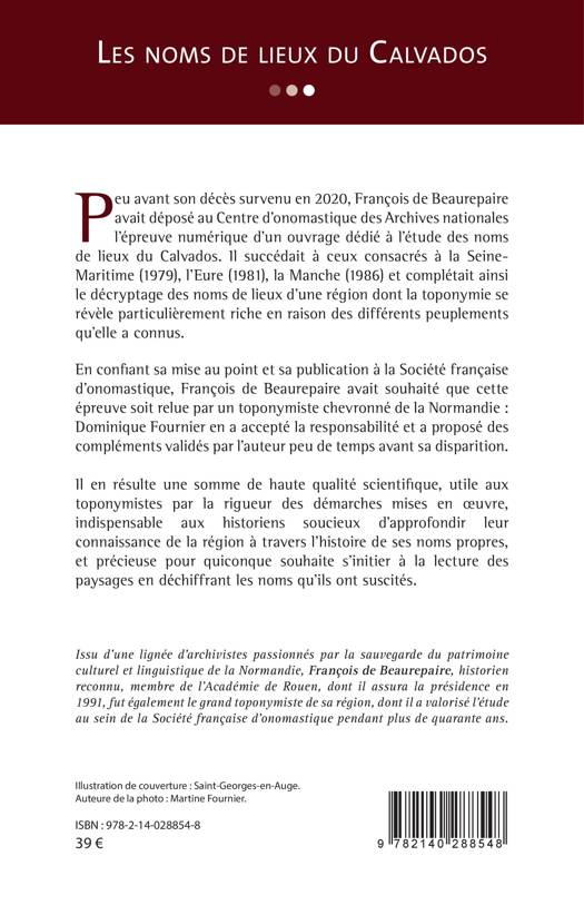 Peu avant son décès en 2020, François de Beaurepaire avait achevé cet ouvrage consacré à l'étude des noms de lieux du Calvados. Il succédait à celui sur l'Eure (1981), la Seine-Maritime (1981), la Manche (1986) et complétait ainsi le décryptage des noms de lieux d'une région dont la toponymie se révèle particulièrement riche en raison des différents peuplements qu'elle a connus. Il en résulte une somme de haute qualité scientifique, utile aux toponymistes par la rigueur des démarches mises en oeuvre, indispensable aux historiens soucieux d'approfondir leur connaissance de la région à travers l'histoire de ses noms propres, et précieuse pour quiconque souhaite s'initier à la lecture des paysages en déchiffrant les noms qu'ils ont suscités.