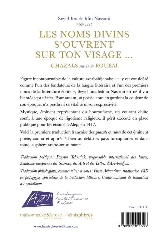 Figure incontournable de la culture azerbaïdjanaise – il y est considéré comme l’un des fondateurs de la langue littéraire et l’un des premiers noms de la littérature écrite – Seyid Imadeddin Nassimi, est né il y a bientôt sept siècles. Pour autant, sa poésie, tout en gardant la couleur de leur époque, n’a perdu ni sa vitalité ni son expressivité. Mystique, éminent représentant du houroufisme, un courant chiite soufi, à une époque de rigorisme religieux, il périt exécuté en place publique pour hérétisme, à Alep, en 1417. Voici la première traduction française des ghazals et rubaï de cet éminent poète, connu et apprécié bien au-delà des pays turcophones et dans toute la sphère arabo-musulmane.