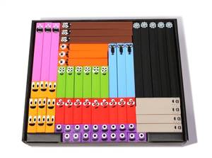 La boite de 126 réglettes à manipuler est composée de 36 Noums 1 ; 18 Noums 2 ; 18 Noums 3 ; 12 Noums 4 ; 8 Noums 5 ; 6 Noums 6 ; 6 Noums 7 ; 6 Noums 8 ; 6 Noums 9 et 10 Noums 10.