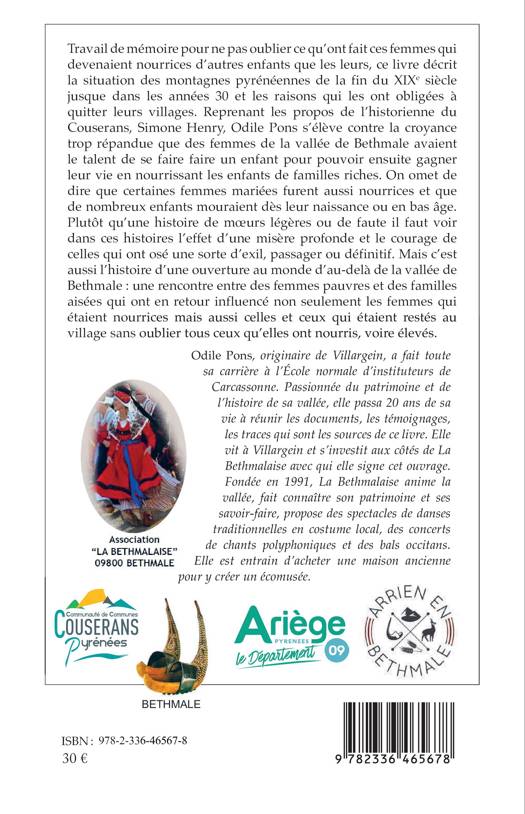 Travail de mémoire pour ne pas oublier ce qu'ont fait ces femmes qui devenaient nourrices d'autres enfants que les leurs, ce livre décrit la situation des montagnes pyrénéennes de la fin du XIXe siècle jusque dans les années 30 et les raisons qui les ont obligées à quitter leurs villages. Reprenant les propos de l'historienne du Couserans, Simone Henry, Odile Pons s'élève contre la croyance trop répandue que des femmes de la vallée de Bethmale avaient le talent de se faire faire un enfant pour pouvoir ensuite gagner leur vie en nourrissant les enfants de familles riches. On omet de dire que certaines femmes mariées furent aussi nourrices et que de nombreux enfants mouraient dès leur naissance ou en bas-âge. Plutôt qu'une histoire de moeurs légères ou de faute il faut voir dans ces histoires l'effet d'une misère profonde et le courage de celles qui ont osé une sorte d'exil, passager ou définitif. Mais c'est aussi l'histoire d'une ouverture au monde d'au-delà de la vallée de Bethmale une rencontre entre des femmes pauvres et des familles aisées qui ont en retour influencé non seulement les femmes qui étaient nourrices mais aussi celles et ceux qui étaient restés au village sans oublier tous ceux qu'elles ont nourris, voire élevés.