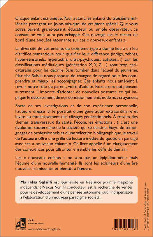 Chaque enfant est unique. Pour autant, ceux du troisième millénaire partagent un je-ne-sais-quoi de vraiment spécial. Que vous soyez parent, grand-parent, éducateur ou simple observateur, ce constat ne vous aura pas échappé. Cet ouvrage est le carnet de bord d’une enquête étonnante sur les « nouveaux enfants ». Sans tomber dans l’écueil du jeunisme, Marielsa Salsilli nous propose de changer de regard pour comprendre ces enfants et mieux les accompagner. Car ils nous amènent à revoir notre rôle de parent, voire d’adulte. À travers des thèmes transversaux (la santé, l’école, les émotions…), c’est une évolution souterraine de la société qui se dessine. Forte de ses investigations et de son expérience personnelle, l’auteur dresse le portrait d’une génération extraordinaire. Son travail offre une lecture inédite du quotidien partagé avec ces « nouveaux enfants » et appelle à l’élargissement des consciences pour affronter ensemble les défis de demain.