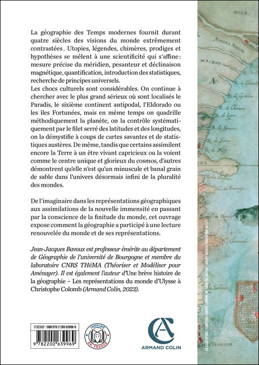 La géographie des Temps modernes fournit durant quatre siècles des visions du monde extrêmement contrastées  : utopies, légendes, chimères, prodiges et hypothèses se mêlent à une scientificité qui s'affine  : mesure précise du méridien, pesanteur et déclinaison magnétique, quantification, introduction des statistiques, recherche de principes universels.