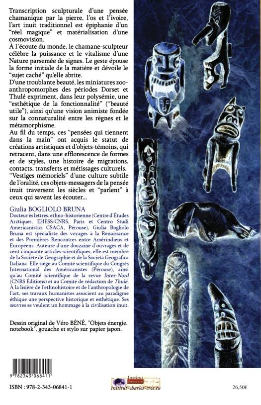 Transcription sculpturale d'une pensée chamanique par la pierre, l'os et l'ivoire, l'art inuit traditionnel est épiphanie d'un "réel magique" et matérialisation d'une cosmovision. D'une troublante beauté, les miniatures zooanthropomorphes des périodes Dorset et Thulé expriment, dans leur polysémie, une "esthétique de la fonctionnalité", ainsi qu'une vision animiste fondée sur la connaturalité entre les règnes et le métamorphisme.