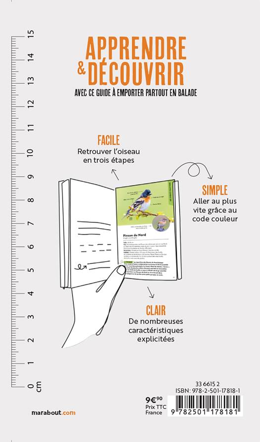 Vous apercevez un oiseau et vous aimeriez apprendre son nom. Consultez d’abord le code couleur pour savoir à quel groupe il appartient. Il ne reste plus que quelques espèces. Comparez votre oiseau avec les photos sélectionnées dans ce livre et retrouvez très vite la bonne espèce.