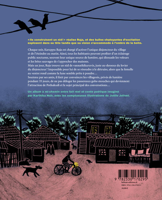 Un album à mi-chemin entre fait réel et conte poétique : les habitants de Pothakudi, un village du Tamil Nadu au Sud-est de l'Inde, décident de se priver de l'électricité publique, la seule à laquelle ils ont accès, pendant plus de 35 jours pour préserver un nid installé dans le générateur. Les oisillons deviennent l'attraction du village et le sujet principal des conversations...