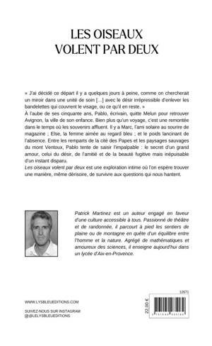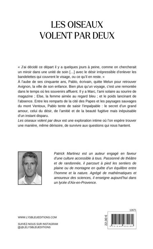 « J'ai décidé ce départ il y a quelques jours à peine, comme on chercherait un miroir dans une unité de soin [...] avec le désir irrépressible d'enlever les bandelettes qui couvrent le visage, ou ce qu'il en reste. » À l'aube de ses cinquante ans, Pablo, écrivain, quitte Melun pour retrouver Avignon, la ville de son enfance. Bien plus qu'un voyage, c'est une remontée dans le temps où les souvenirs affluent. Il y a Marc, l'ami solaire au sourire de magazine ; Else, la femme aimée au regard bleu ; et le poids lancinant de l'absence. Entre les remparts de la cité des Papes et les paysages sauvages du mont Ventoux, Pablo tente de saisir l'impalpable : le secret d'un grand amour, celui du désir, de l'amitié et de la beauté fugitive mais inépuisable d'un instant disparu. Les oiseaux volent par deux est une exploration intime où l'on espère trouver une manière, même dérisoire, de survivre aux questions qui nous hantent.