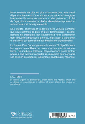 Nous sommes de plus en plus conscients que notre santé dépend notamment d’une alimentation saine et biologique. Mais cette démarche se heurte à un réel problème : du fait de l’agriculture intensive, la chaîne alimentaire s’appauvrit en sels minéraux et en oligoéléments. Des études scientifiques récentes sont venues confirmer que nous sommes de plus en plus déminéralisés : ce phénomène est imputable non seulement à notre alimentation dont la qualité a beaucoup diminué, mais aussi à la pollution et au stress qui accroissent nos besoins en oligoéléments. Le docteur Paul Dupont présente le rôle de 22 oligoéléments, les signes perceptibles de carence et les sources alimentaires. De nombreux tableaux étayent ce livre que le lecteur pourra à tout moment consulter très aisément pour connaître ses besoins quotidiens et les aliments capables d’y répondre.