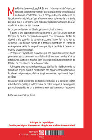 Medieviste de renom, Joseph R. Strayer n'a jamais cesse d'interroger la nature et le fonctionnement des grandes monarchies feodales en Europe occidentale. C'est a l'apogee de cette recherche ou l'erudition du specialiste s'est affrontee aux problemes de la theorie politique que J. R. Strayer a livre, dans Les Origines medievales de l'Etat moderne, le sens de ses travaux. Le propos de l'auteur se developpe dans trois directions: A partir d'une opposition contrastee avec la Cite-Etat, d'une part, et l'Empire, de l'autre, comprendre ce qu'est l'Etat moderne et tenter de repondre a la question de sa naissance, que Strayer fait remonter au XIIe siecle. C'est au sein meme de la feodalite qu'est nee en France et en Angleterre cette forme politique specifique destinee a devenir un modele presque universel. Presenter l'hypothese nouvelle que les premieres institutions permanentes concernaient les affaires interieures et non les affaires exterieures. Justice et finance sont les lieux d'institutionnalisation de l'Etat et de constitution de la bureaucratie. Faire apparaitre combien le processus d'edification de l'Etat moderne prend son origine dans la destruction des appartenances familiales, locales et religieuses pour laisser surgir un nouveau loyalisme a l'egard de l'Etat. Si l'auteur tend a repondre de facon affirmative a la question: l'Etat est-il l'horizon politique indepassable de notre temps ?, il n'en rappelle pas moins que decrire un phenomene n'est pas signe qu'on l'approuve.