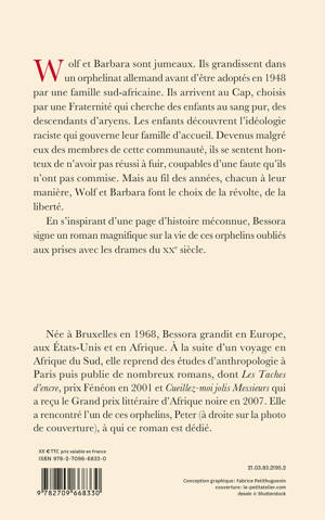 Wolf et Barbara sont jumeaux. Ils grandissent dans un orphelinat allemand avant d’être adoptés en 1948 par une famille sud-africaine. Ils arrivent au Cap, choisis par une Fraternité qui cherche des enfants au sang pur, des descendants d’aryens. Les enfants découvrent l’idéologie raciste qui gouverne leur famille d’accueil. Devenus malgré eux des membres de cette communauté, ils se sentent honteux de n’avoir pas réussi à fuir, coupables d’une faute qu’ils n’ont pas commise. Mais au fil des années, chacun à leur manière, Wolf et Barbara font le choix de la révolte, de la liberté.