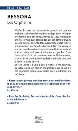 Wolf et Barbara sont jumeaux. Ils grandissent dans un orphelinat allemand avant d’être adoptés en 1948 par une famille sud-africaine. Arrivés au Cap, choisis par une Fraternité qui cherche des descendants d’aryens au sang pur, les enfants découvrent l’idéologie raciste qui gouverne leur famille d’accueil. Devenus malgré eux des membres de cette communauté, ils se sentent honteux de n’avoir pas réussi à fuir, coupables d’une faute qu’ils n’ont pas commise. Mais au fil des années, chacun à sa manière, Wolf et Barbara font le choix de la révolte, de la liberté. En s’inspirant d’une page d’histoire méconnue, Bessora signe un roman magnifique sur la vie de ces orphelins oubliés aux prises avec les drames du XXe siècle.