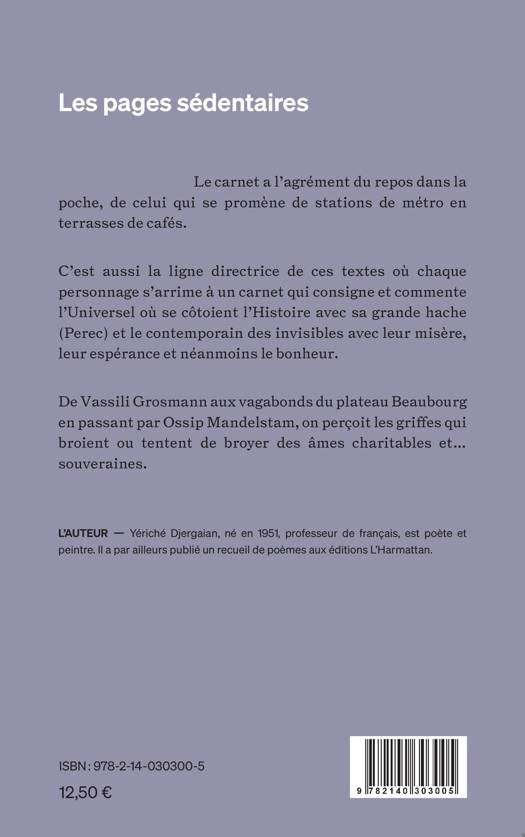 Le carnet a l'agrément du repos dans la poche, de celui qui se promène de stations de métro en terrasses de cafés. C'est aussi la ligne directrice de ces textes où chaque personnage s'arrime à un carnet qui consigne et commente l'Universel où se côtoient l'Histoire avec sa grande hache (Perec) et le contemporain des invisibles avec leur misère, leur espérance et néanmoins le bonheur. De Vassili Grosmann aux vagabonds du plateau Beaubourg en passant par Ossip Mandelstam, on perçoit les griffes qui broient ou tentent de broyer des âmes charitables et... souveraines.