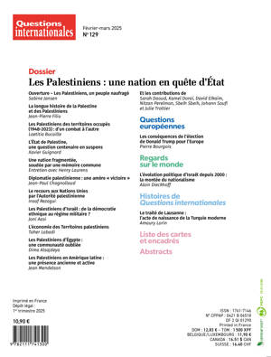 L'attaque du Hamas contre Israël le 7 octobre 2023 et les contre-attaques d'Israël dans la bande de Gaza depuis ont remis la question palestinienne au cœur de l’actualité internationale. L’esprit de cette livraison de Questions internationales est de prendre du recul avec l’actuel conflit qui oppose le Hamas à Israël afin d’offrir aux lecteurs des clés de compréhension sur l’histoire du peuple palestinien, la société, la vie politique, l’économie ou la diplomatie palestinienne. Cette étude en profondeur de l’identité palestinienne permet de mieux comprendre les ressorts d’un conflit qui dure depuis plus d’un siècle et qui connait actuellement un nouveau paroxysme.