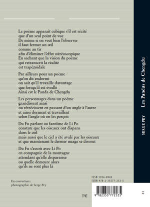 Ce livre est écrit lors d’un séjour à Chengdu, (Chine), de Serge Pey. Les 55 poèmes du livre, convoquent le séjour de Serge Pey, les lieux, les poètes Du Fu originaire de Chang’an, capitale de la dynastie Tang et Li Po (tous deux du 8ème siècle). Poésie forgée de toute pièce avec les restes du chinois et du français et vice-versa comme cette Fiat Panda qui est tout à la fois le véhicule en panne de roue / la lune est une roue de secours / et / le décret du Panda / qu’il soit fait comme le Panda (Du Fu) / FIAT : Décret /. Fidèle à la voix de Serge Pey qui rappelle que / la poésie dérègle le manège des métaphysiques / elle nous dévoile qu’ / en raison de la vitesse de la voiture / une métaphore / peut devenir si on n’y prend garde / une voiture stationnant / sur le parking avarié de la poésie /. Serge Pey croise sa langue en miroir avec celle de Du Fu qui en son temps introduit dans la poésie des thèmes liés à la vie quotidienne, à la responsabilité sociale du poète, à la dénonciation des injustices de son temps.