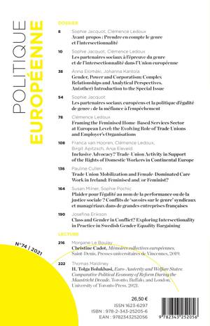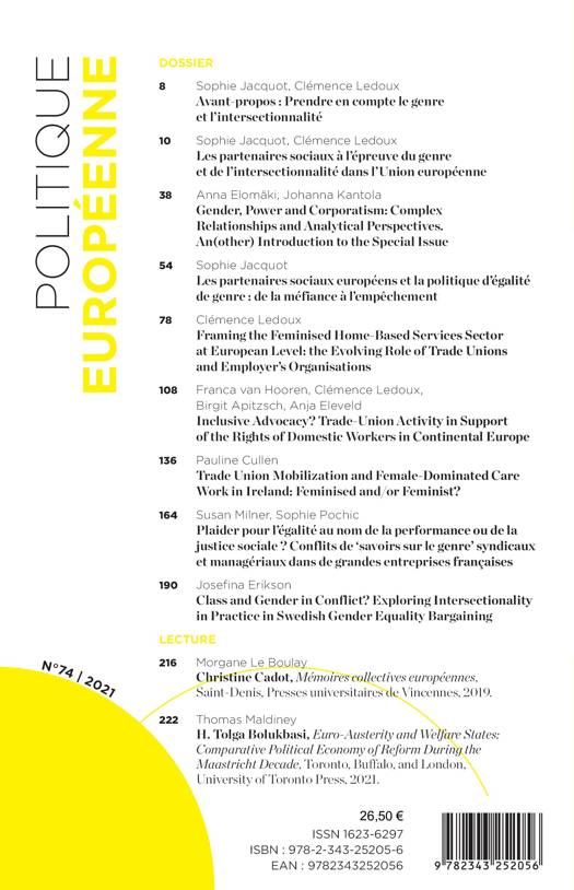 Au sommaire : Avant-propos : Prendre en compte le genre et l’intersectionnalité / Les partenaires sociaux à l’épreuve du genre et de l’intersectionnalité dans l’Union européenne / Gender, Power and Corporatism: Complex Relationships and Analytical Perspectives / Les partenaires sociaux européens et la politique d’égalité de genre : de la méfiance à l’empêchement / Framing the Feminised Home-Based Services Sector at European Level: the Evolving Role of Trade Unions and Employer’s Organisations / Inclusive Advocacy? Trade-Union Activity in Support of the Rights of Domestic Workers in Continental Europe / Trade Union Mobilization and Female-Dominated Care Work in Ireland: Feminised and/or Feminist? / Plaider pour l’égalité au nom de la performance ou de la justice sociale ? Conflits de ‘savoirs sur le genre’ syndicaux et managériaux dans de grandes entreprises françaises / Class and Gender in Conflict? Exploring Intersectionality in Practice in Swedish Gender Equality Bargaining