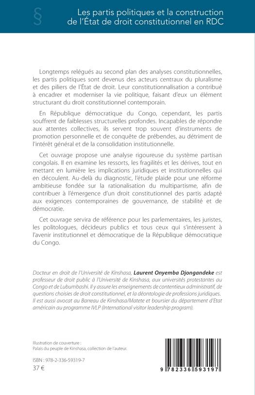 Longtemps relégués au second plan des analyses constitutionnelles, les partis politiques sont devenus des acteurs centraux du pluralisme et des piliers de l'État de droit. Leur constitutionnalisation a contribué à encadrer et moderniser la vie politique, faisant d'eux un élément structurant du droit constitutionnel contemporain. En République démocratique du Congo, cependant, les partis souffrent de faiblesses structurelles profondes. Incapables de répondre aux attentes collectives, ils servent trop souvent d'instruments de promotion personnelle et de conquête de prébendes, au détriment de l'intérêt général et de la consolidation institutionnelle. Cet ouvrage propose une analyse rigoureuse du système partisan congolais. Il en examine les ressorts, les fragilités et les dérives, tout en mettant en lumière les implications juridiques et institutionnelles qui en découlent. Au-delà du diagnostic, l'étude plaide pour une réforme ambitieuse fondée sur la rationalisation du multipartisme, afin de contribuer à l'émergence d'un droit constitutionnel des partis adapté aux exigences contemporaines de gouvernance, de stabilité et de démocratie.