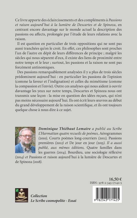 Ce livre apporte des éclaircissements et des compléments à Passions et raison aujourd'hui à la lumière de Descartes et de Spinoza, en centrant encore davantage sur le monde actuel la description des passions ou affects, prolongée par l'étude de leurs relations avec la raison. Il est question en particulier de trois oppositions qui ne sont pas aussi tranchées qu'on le croit. En effet, ces philosophes sont proches l'un de l'autre en dépit de leurs différences de principe ; malgré les siècles qui nous séparent d'eux, il existe des liens de proximité entre notre temps et le leur ; surtout, les passions et la raison ne sont pas forcément antinomiques.