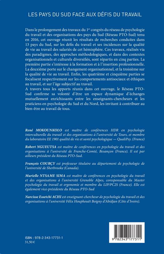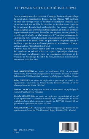 Dans le prolongement des travaux du 1er congrès du réseau de psychologie du travail et des organisations des pays du Sud (Réseau PTO-Sud) tenu en 2016, cet ouvrage réunit les résultats de recherches conduites dans 13 pays du Sud, sur les défis du travail et et ses incindences sur la qualité de vie au travail des salariés de cet hémisphère. Ces travaux réalisés via des paradigmes, des approches méthodologiques, et dans des contextes organisationnels et culturels diversifiés, sont répartis en cinq parties.