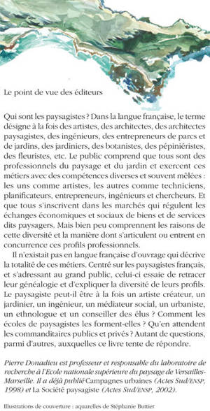 «Pierre Donadieu est professeur et responsable du laboratoire de recherche à l'Ecole nationale supérieure du paysage de Versailles- Marseille. Il a déjà publié Campagnes urbaines (Actes Sud/ENSP, 1998) et La Société paysagiste (Actes Sud/ENSP, 2002).»