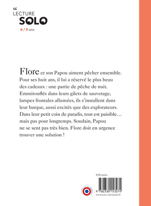 Flore et son Papou aiment pêcher ensemble. Pour ses huit ans, il lui a réservé le plus beau des cadeaux : une partie de pêche de nuit. Emmitouflés dans leurs gilets de sauvetage, lampes frontales allumées, ils s'installent dans leur barque, aussi excités que des explorateurs. Dans leur petit coin de paradis, tout est paisible... mais pas pour longtemps. Soudain, Papou ne se sent pas très bien. Flore doit en urgence trouver une solution !