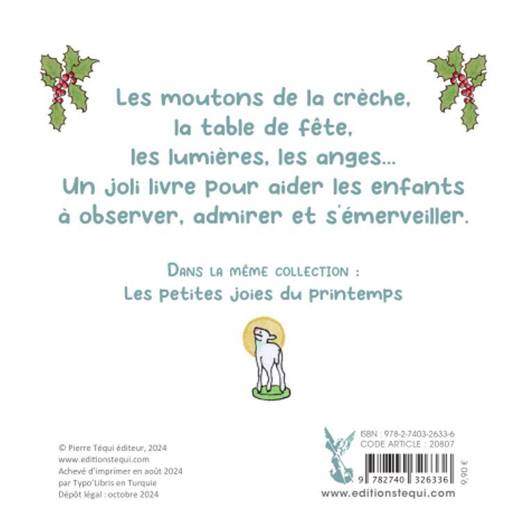 Les moutons de la crèche, la table de fête, les lumières, les anges… Ce petit livre invite les jeunes enfants à faire attention aux détails qui créent la magie de Noël. Guidé par ses parents ou éducateurs, l'enfant apprendra à observer, s'intéresser, admirer, s'émerveiller. Avec son contenu intéressant et ses phrases courtes et simples, ce livre pourra aussi intéresser l'enfant qui commence à lire tout seul.