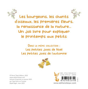 Les bourgeons, les premières fleurs, les cloches de Pâques… Ce petit livre invite les jeunes enfants à faire attention aux détails de la nature qui s'éveille après le sommeil de l'hiver. Guidé par ses parents ou éducateurs, l'enfant apprendra à observer, s'intéresser, admirer, s'émerveiller pour comprendre la joie de Pâques et la victoire de la vie sur les ténèbres et la mort. Avec ses phrases courtes et simples, ce livre pourra aussi intéresser l'enfant qui commence à lire tout seul.