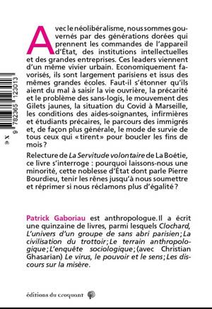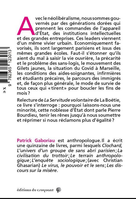 À nos portes, des migrants et des personnes sans logis connaissent la misère extrême et meurent dans le dénuement le plus absolu, des milliers de personnes fréquentent les centres d’aide alimentaire, et la vie se poursuit, comme si cela paraissant dans l’ordre du monde. Sur le plan politique, nous sommes gouvernés par les valeurs intouchables du néolibéralisme et par des générations dorées qui prennent les commandes de l’appareil d’État, des institutions intellectuelles et des grandes entreprises. Ces leaders viennent d’un même vivier. Faut-il s’étonner qu’ils aient du mal à saisir la vie ouvrière, la précarité et le problème des sans-logis, le mouvement des Gilets jaunes, etc. La raison de ce livre tient à cette interrogation : pourquoi la majorité des gens ne se révolte-t-elle pas face à cette noblesse d’État dont parle Pierre Bourdieu ? Pourquoi laissons-nous une minorité pitoyable tenir les rênes jusqu’à nous pourrir la vie si nous réclamons plus d’égalité ?