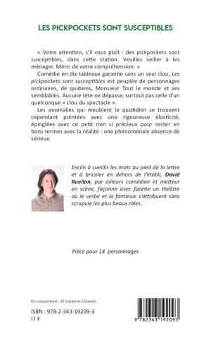 "Votre attention, s'il vous plaît : des pickpockets sont susceptibles, dans cette station. Veuillez veiller à les ménager. Merci de votre compréhension". "Les Pickpockets sont susceptibles" est une pièce peuplée de personnages ordinaires, de quidams et autres Monsieur Tout le monde. Les anomalies qui meublent le quotidien s'y trouvent cependant pointées avec une rigoureuse élasticité et une phénoménale absence de sérieux.