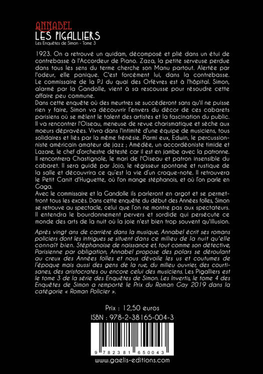 1923On a retrouvé un quidam, décomposé et plié dans un étui de contrebasse à l'Accordeur de Piano. Zaza, la petite serveuse perdue dans tous les sens du terme cherche son Manu partout. Alertée par l'odeur, elle panique. C'est forcément lui, dans la contrebasse. Le commissaire de la PJ du quai des Orfèvres est à l'hôpital. Simon, alarmé par la Gandolle, vient à sa rescousse pour résoudre cette affaire peu commune. Dans cette enquête où des meurtres se succéderont sans qu'il ne puisse rien y faire, Simon va découvrir l’envers du décor de ces cabarets parisiens où se mêlent le talent des artistes et la fascination du public. Il va rencontrer l'Oiseau, meneuse de revue charismatique et sèche aux moeurs dépravées. Vivra dans l'intimité d'une équipe de musiciens, tous solidaires et liés par la même frénésie. Parmi eux, Edwin, le percussionniste américain amateur de jazz ; Amédée, un accordéoniste timide et Lazare, le chef d’orchestre détesté car il est en jambe avec la patronne. Il rencontrera Chastignole, le mari de l'Oiseau et patron insensible du cabaret. Il sera guidé par Jojo, le régisseur spontané et rustique de la salle et découvrira ce qu’est la vie d’un croque-note. Il retrouvera le Petit Canit d'Huguette, où l'on mange stéphanois, et où l’on parle en Gaga. Avec le commissaire et la Gandolle ils parleront en argot et se permettront tous les excès. Dans cette enquête du début des Années folles, Simon se retrouve au spectacle, celui que l’on ne montre pas aux spectateurs. Il entendra le bourdonnement pervers et sordide qui persécute ce monde des arts de la nuit où la joie n'est bien trop souvent qu'illusion.