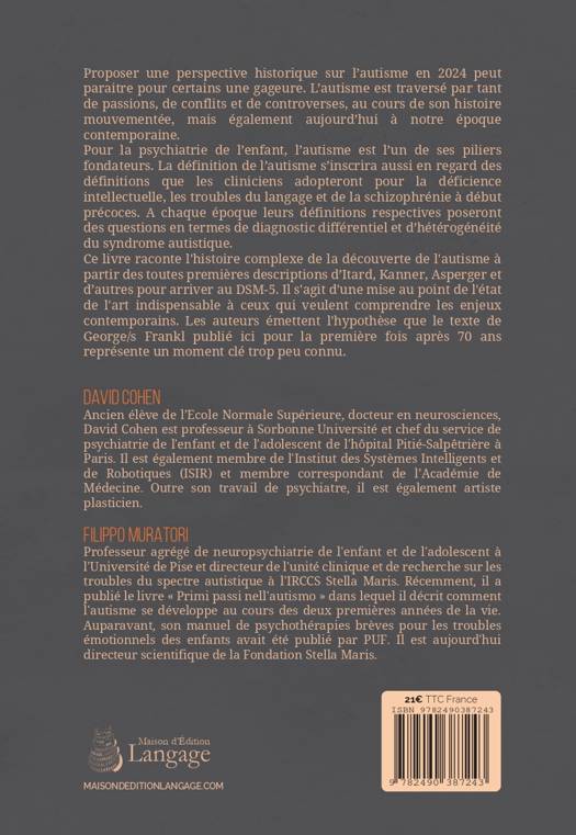 Proposer une perspective historique sur l’autisme en 2024 peut paraitre pour certains une gageure. L’autisme est traversé par tant de passions, de conflits et de controverses, au cours de son histoire mouvementée, mais également aujourd’hui à notre époque contemporaine. Pour la psychiatrie de l’enfant, l’autisme est l’un de ses piliers fondateurs. La définition de l’autisme s’inscrira aussi en regard des définitions que les cliniciens adopteront pour la déficience intellectuelle, les troubles du langage et de la schizophrénie à début précoces. A chaque époque leurs définitions respectives poseront des questions en termes de diagnostic différentiel et d’hétérogénéité du syndrome autistique.<br /> Ce livre raconte l'histoire complexe de la découverte de l'autisme à partir des toutes premières descriptions d’Itard, Kanner, Asperger et d’autres pour arriver au DSM-5. Il s'agit d'une mise au point de l'état de l'art indispensable à ceux qui veulent comprendre les enjeux <br /> contemporains. Les auteurs émettent l'hypothèse que le texte de George/s Frankl publié ici pour la première fois après 70 ans représente un moment clé trop peu connu.