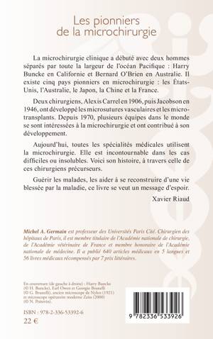 La microchirurgie clinique a débuté avec deux hommes séparés par toute la largeur de l'océan Pacifique: Harry Buncke en Californie et Bernard O'Brien en Australie. Il existe cinq pays pionniers en microchirurgie: les États-Unis, l'Australie, le Japon, la Chine et la France. Deux chirurgiens, Alexis Carrel en 1906, puis Jacobson en 1946, ont développé les microsutures vasculaires et les microtransplants. Depuis 1970, plusieurs équipes dans le monde se sont intéressées à la microchirurgie et ont contribué à son développement. Aujourd'hui, toutes les spécialités médicales utilisent la microchirurgie. Elle est incontournable dans les cas difficiles ou insolubles. Voici son histoire, à travers celle de ces chirurgiens précurseurs. Guérir les malades, les aider à se reconstruire d'une vie blessée par la maladie, ce livre se veut un message d'espoir. Xavier Riaud