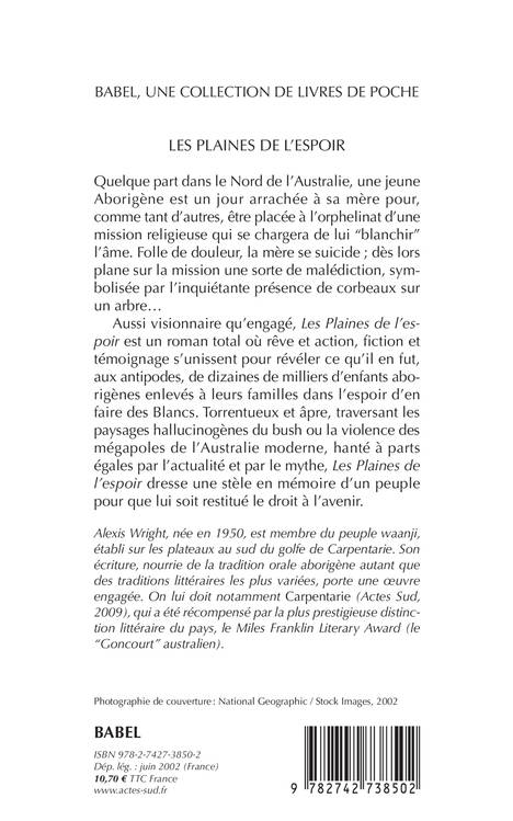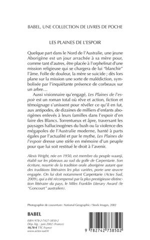 Aussi visionnaire qu'engagé, «Les Plaines de l'espoir» est un roman total où rêve et action, fiction et témoignage s'unissent pour révéler ce qu'il en fut, aux antipodes, de dizaines de milliers d'enfants aborigènes enlevés à leurs familles dans l'espoir d'en faire des Blancs. Torrentueux et âpre, traversant les paysages hallucinogènes du bush ou la violence des mégapoles de l'Australie moderne, hanté à parts égales par l'actualité et par le mythe, Les Plaines de l'espoir dresse une stèle en mémoire d'un peuple pour que lui soit restitué le droit à l'avenir.