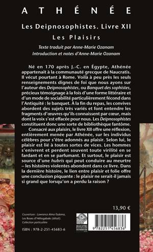 Ne en 170 apres J.-C. en Egypte, Athenee appartenait a la communaute grecque de Naucratis. Il vecut pourtant a Rome. Voila a peu pres les seuls renseignements dignes de foi que nous ayons sur l'auteur des Deipnosophistes, ou Banquet des sophistes, precieux temoignage a la fois d'une forme litteraire et d'un mode de sociabilite particulierement fecond dans l'Antiquite: le banquet. A la fin du repas, les convives abordent des sujets tres varies et font entendre les fragments d'oeuvres qu'ils connaissent par coeur, mais dont la voix s'est effacee pour nous. Les Deipnosophistes constituent donc une sorte de bibliotheque fantome. Consacre aux plaisirs, le livre XII offre une reflexion, entierement menee par Athenee, sur les individus celebres pour s'etre adonnes au plaisir. Selon lui, le plaisir est lie a toutes sortes de vices. Les hommes s'enivrent et perdent souvent toute virilite en se fardant et en se parfumant. Et surtout, le plaisir estsource d'une hubris qui peut conduire au meurtre - les histoires violentes abondent dans ce livre. Dans la derniere histoire, le lien entre plaisir et folie offre une conclusion piquante: le plaisir ne serait-il jamais si grand que lorsqu'on a perdu la raison ?