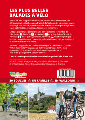 Riches de leur longue expérience, les auteurs nous emmènent à la découverte des plus beaux endroits de la Wallonie, ils traversent tantôt un village pittoresque, tantôt une ville aux nombreuses pistes cyclables ou de splendides paysages parfois encore méconnus. Chaque promenade comprend une carte détaillée, le nombre de kilomètres, la durée, le dénivelé et le degré de difficulté du parcours, ainsi que l'âge minimum requis, une fiche pratique avec des suggestions de restaurants, d'endroits pour des pique-niques et bien d'autres informations. Pour ses cinq provinces, la Wallonie compte 227 circuits VTT et 36 circuits VTC reconnus, 1 300 kilomètres de RAVeL mais également 1 538 kilomètres d'itinéraires longue distance... Une offre qui augmente chaque année ! Les cartes des promenades sont téléchargeables via notre site.