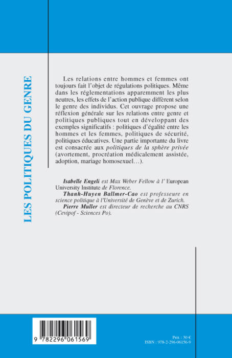 Les relations entre hommes et femmes ont toujours fait l'objet de régulations politiques. Cet ouvrage propose une réflexion générale sur les relations entre genre et politiques publiques tout en développant des exemples significatifs : politiques d'égalité entre les hommes et les femmes, politiques de sécurité, politiques éducatives. Une partie importante est consacrée à la sphère privée (avortement, procréation médicalement assistée, adoption, mariage homosexuel...).