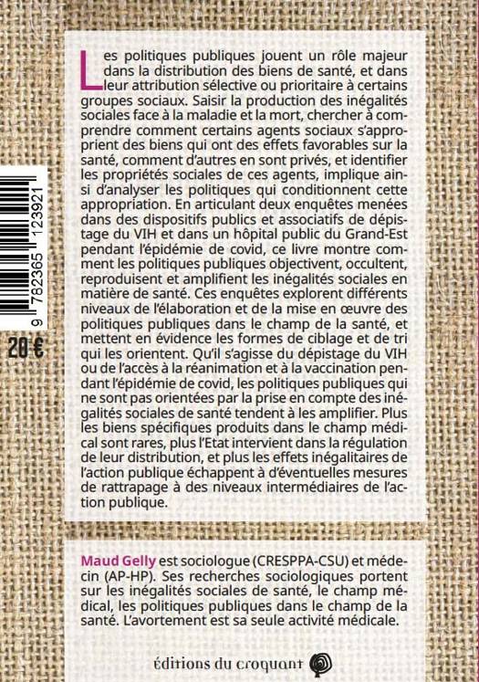 Les politiques publiques jouent un rôle majeur dans la distribution des biens de santé, et dans leur attribution sélective ou prioritaire à certains groupes sociaux. Pour saisir la production des inégalités sociales face à la maladie et la mort, chercher à comprendre comment certains agents sociaux s’approprient des biens qui ont des effets favorables sur la santé, comment d’autres en sont privés, et identifier les propriétés sociales de ces agents, il faut donc analyser les politiques qui conditionnent cette appropriation. En articulant deux enquêtes menées dans des dispositifs publics et associatifs de dépistage du VIH et dans un hôpital public du Grand-Est pendant l’épidémie de covid, ce livre montre comment les politiques publiques objectivent, occultent, reproduisent et amplifient les inégalités sociales en matière de santé. Ces enquêtes les politiques publiques dans le champ de la santé, et mettent en évidence les formes de ciblage et de tri qui les orientent. Qu’il s’agisse du dépistage du VIH ou de l’accès à la réanimation et à la vaccination pendant l’épidémie de covid, les politiques publiques qui ne sont pas orientées par la prise en compte des inégalités sociales de santé tendent à les amplifier. Plus les biens spécifiques produits dans le champ médical sont rares, plus l’Etat intervient dans la régulation de leur distribution, et plus les effets inégalitaires de l’action publique échappent à d’éventuelles mesures de rattrapage à des niveaux intermédiaires de l’action publique. Maud Gelly est sociologue (CRESPPA-CSU) et médecin (AP-HP). Ses recherches sociologiques portent sur les inégalités sociales de santé, le champ médical, les politiques publiques dans le champ de la santé. L’avortement est sa seule activité médicale.