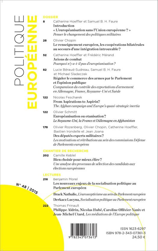 Sommaire : « L'européanisation sans l'Union européenne ? / Le renseignement européen, les coopérations bilatérales au secours d'une intégration introuvable ? / Avions de combat / Réguler le commerce des armes par le Parlement et l'opinion publique / From Aspirations to Aspirin? / Européanisation ou otanisation ? Des députés experts militaires ? / Bien choisir pour mieux élire ? / Les nouveaux enjeux de la socialisation politique au Parlement européen