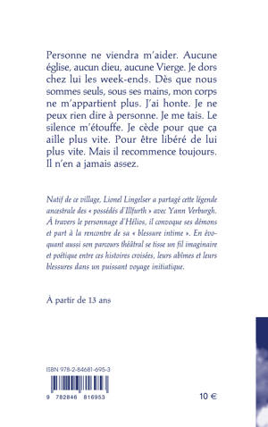 Au milieu du XIXᵉ siècle, dans le village d'Illfurth au sud de l'Alsace, d'étranges phénomènes secouent la modeste famille Burner. Joseph, 7 ans, et Thiébaut, 9 ans, sont soudainement atteints d'un mal mystérieux et spectaculaire. Les autorités religieuses s'accordent pour déclarer les deux enfants possédés par des esprits démoniaques et procèdent à leur exorcisme. Natif de ce village, le comédien et metteur en scène Lionel Lingelser a partagé cette légende ancestrale avec Yann Verburgh. À travers le personnage d'Hélios, avatar fantasmé de l'enfant qu'il était, il convoque ses démons, part à la rencontre de sa « blessure intime » et, en évoquant aussi son parcours théâtral, il se tisse un fil imaginaire et poétique entre ces histoires croisées, leurs abîmes et leurs blessures dans un puissant voyage initiatique. Un chemin de résilience porté par la joie, qui célèbre le pouvoir de l'imaginaire et affirme la puissance salvatrice du théâtre. Ce texte rend hommage à la part d'enfance et d'innocence où tous les fantasmes sont possibles et qui aide l'imaginaire à se transformer en un refuge, une forteresse inébranlable face aux assauts du réel.