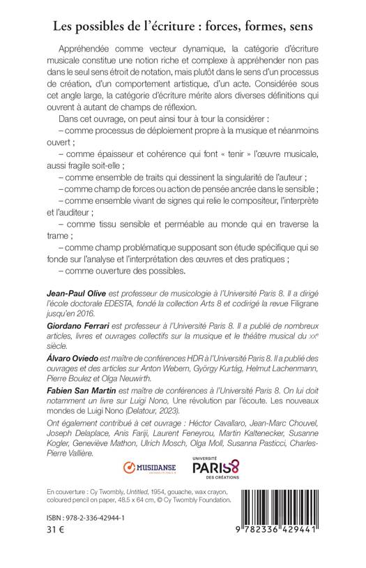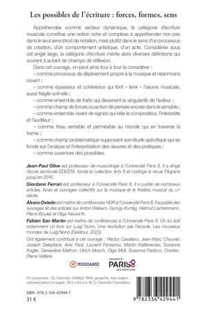 Appréhendée comme vecteur dynamique, la catégorie d'écriture musicale constitue une notion riche et complexe à appréhender non pas dans le seul sens étroit de notation, mais plutôt dans le sens d'un processus de création, d'un comportement artistique, d'un acte. Considérée sous cet angle large, la catégorie d'écriture mérite alors diverses définitions qui ouvrent à autant de champs de réflexion. Dans cet ouvrage, on peut ainsi tour à tour la considérer: - comme processus de déploiement propre à la musique et néanmoins ouvert; - comme épaisseur et cohérence qui font tenir l'oeuvre musicale, aussi fragile soit-elle; - comme ensemble de traits qui dessinent la singularité de l'auteur; - comme champ de forces ou action de pensée ancrée dans le sensible; - comme ensemble vivant de signes qui relie le compositeur, l'interprète et l'auditeur; - comme tissu sensible et perméable au monde qui en traverse la trame; - comme champ problématique supposant son étude spécifique qui se fonde sur l'analyse et l'interprétation des oeuvres et des pratiques; - comme ouverture des possibles.