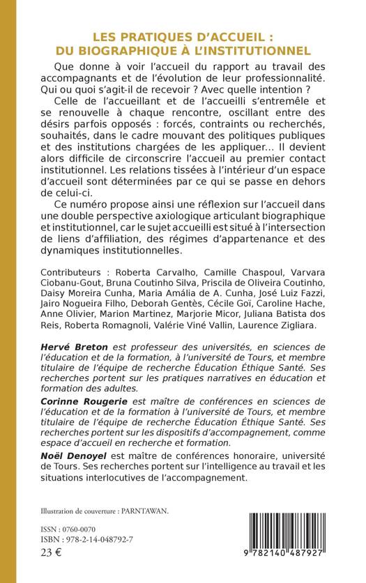 Que donne à voir l'accueil du rapport au travail des accompagnants et de l'évolution de leur professionnalité. Qui ou quoi s'agit-il de recevoir ? Avec quelle intention ? Celle de l'accueillant et de l'accueilli s'entremêle et se renouvelle à chaque rencontre, oscillant entre des désirs parfois opposés: forcés, contraints ou recherchés, souhaités, dans le cadre mouvant des politiques publiques et des institutions chargées de les appliquer... Il devient alors difficile de circonscrire l'accueil au premier contact institutionnel. Les relations tissées à l'intérieur d'un espace d'accueil sont déterminées par ce qui se passe en dehors de celui-ci. Ce numéro propose ainsi une réflexion sur l'accueil dans une double perspective axiologique articulant biographique et institutionnel, car le sujet accueilli est situé à l'intersection de liens d'affiliation, des régimes d'appartenance et des dynamiques institutionnelles.