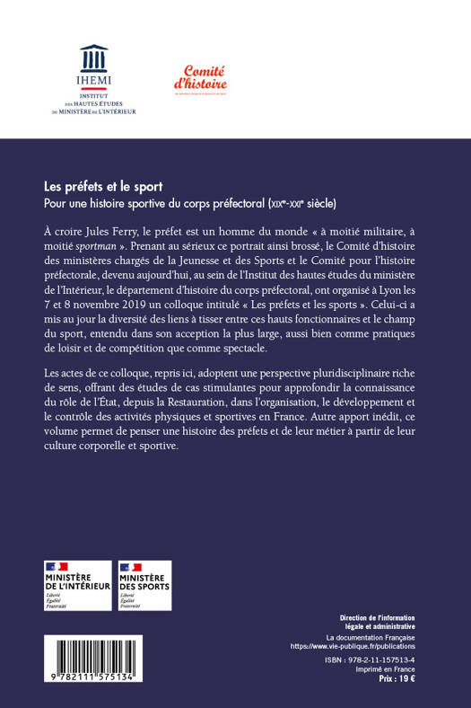 Les cas mis en lumière et les stimulantes pistes de recherche tracées au cours du colloque « Les préfets et les sports » qui s’est tenu à Lyon les 7 et 8 novembre 2019 ont pourtant montré la diversité des liens à tisser entre le corps préfectoral et le champ du sport, entendu dans son acception la plus large, aussi bien comme pratiques de loisir et de compétition que comme spectacle. Cet ouvrage entend approfondir la connaissance du rôle de l’État dans l’organisation, le développement et le contrôle des diverses activités physiques et sportives en France, au prisme de la figure de son plus haut représentant civil dans les territoires. À cet effet, il propose une tranche chronologique qui s’étend de la Restauration à nos jours et s’efforce de mettre en lumière l’action préfectorale dans la conduite, encore trop méconnue, des politiques sportives au niveau départemental.
