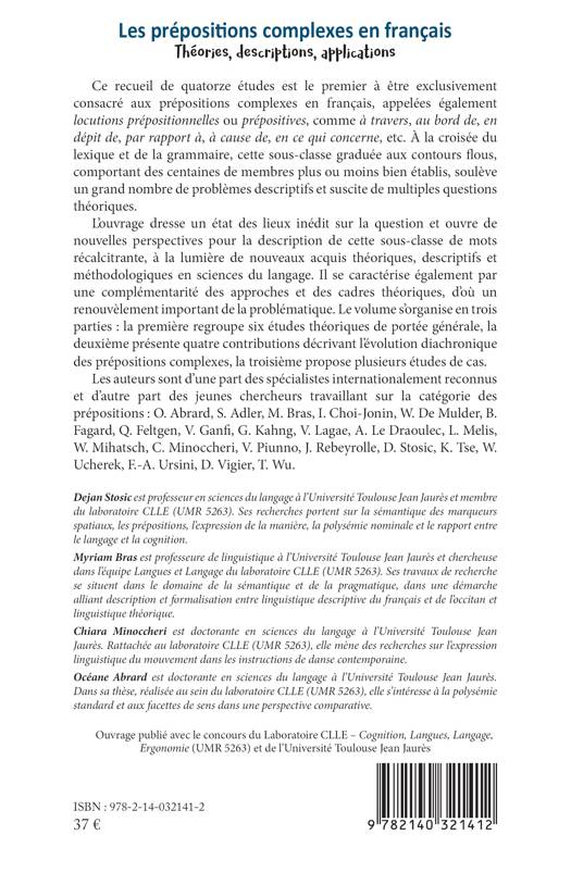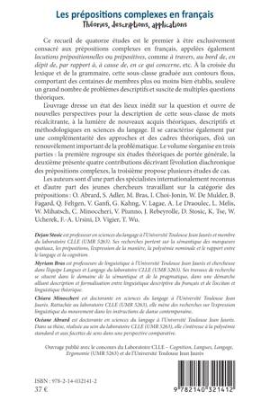 Ce recueil de quatorze études est le premier à être exclusivement consacré aux prépositions complexes en français, appelées également locutions prépositionnelles ou prépositives, comme à travers, au bord de, en dépit de, par rapport à, à cause de, en ce qui concerne, etc. À la croisée du lexique et de la grammaire, cette sous-classe graduée aux contours flous, comportant des centaines de membres plus ou moins bien établis, soulève un grand nombre de problèmes descriptifs et suscite de multiples questions théoriques. L'ouvrage dresse un état des lieux inédit sur la question et ouvre de nouvelles perspectives pour la description de cette sous-classe de mots récalcitrante, à la lumière de nouveaux acquis théoriques, descriptifs et méthodologiques en sciences du langage. Il se caractérise également par une complémentarité des approches et des cadres théoriques, d'où un renouvèlement important de la problématique. Le volume s'organise en trois parties: la première regroupe six études théoriques de portée générale, la deuxième présente quatre contributions décrivant l'évolution diachronique des prépositions complexes, la troisième propose plusieurs études de cas.