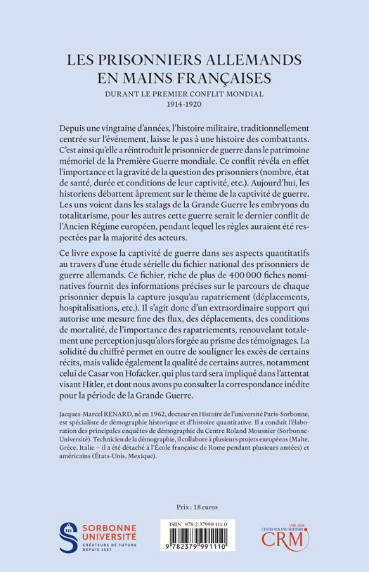 Depuis une vingtaine d'années, l'histoire militaire, traditionnellement centrée sur l'événement, laisse le pas à une histoire des combattants. C'est ainsi qu'elle a réintroduit le prisonnier de guerre dans le patrimoine mémoriel de la Première Guerre mondiale. Ce livre expose la captivité de guerre dans ses aspects quantitatifs au travers d'une étude sérielle du fichier national des prisonniers de guerre allemands. Riche de plus de 400 000 fiches nominatives, il fournit des informations précises sur le parcours de chaque prisonnier depuis la capture jusqu'au rapatriement. Il s'agit donc d'un extraordinaire support qui autorise une mesure fine des flux, des déplacements, des conditions de mortalité, de l'importance des rapatriements, renouvelant totalement une perception jusqu'alors forgée au prisme des témoignages.