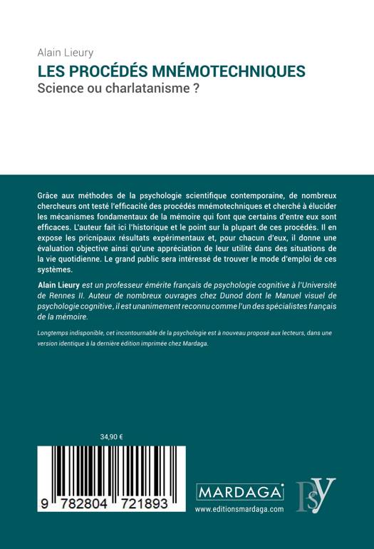 Grâce aux méthodes de la psychologie scientifique contemporaine, de nombreux chercheurs ont testé l'efficacité des procédés mnémotechniques et cherché à élucider les mécanismes fondamentaux de la mémoire qui font que certains d'entre eux sont efficaces. L'auteur fait ici l'historique et le point sur la plupart de ces procédés. Il en expose les pricnipaux résultats expérimentaux et, pour chacun d'eux, il donne une évaluation objective ainsi qu'une appréciation de leur utilité dans des situations de la vie quotidienne. Le grand public sera intéressé de trouver le mode d'emploi de ces systèmes. Alain Lieury est un professeur émérite français de psychologie cognitive à l'Université de Rennes II. Auteur de nombreux ouvrages chez Dunod dont le Manuel visuel de psychologie cognitive, il est unanimement reconnu comme l'un des spécialistes français de la mémoire.