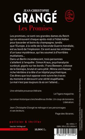Les promises, ce sont ces grandes dames du Reich qui se retrouvent chaque après-midi à l'hôtel Adlon pour bavarder et boire du champagne, tandis que l'Europe, à la veille de la Seconde Guerre mondiale, est au bord de l’implosion. Ce sont aussi les victimes d'un tueur mystérieux, qui les soumet à d'horribles mutilations...