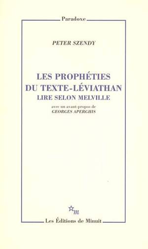 Moby Dick est peut-être avant tout un grand roman sur la lecture. Car le lecteur, quel qu'il soit, est déjà inclus, compris dans le texte. Toujours plus gonflé, ce livre-monstre, véritable Léviathan textuel, semble engloutir le monde et avaler jusqu'à celui qui l'ouvre, tel un nouveau Jonas. Le texte-baleine présente ainsi d'innombrables allégories de la lecture, décrite en termes de pêche, de cartographie, de navigation, de fuite, de naufrage ou de percée. Si un tel livre ne saurait donc être simplement lu, c'est qu'il lit à son tour : non seulement ses lecteurs, mais aussi la Bible, ou encore le Léviathan de Hobbes et sa théorie de l'État. Et dès lors, ce qui s'envoie ou se promet, c'est une dimension prophétique du lire. Elle se lèvera dans le vent de la tempête et annoncera la venue de l'avenir. (P. Sz.)