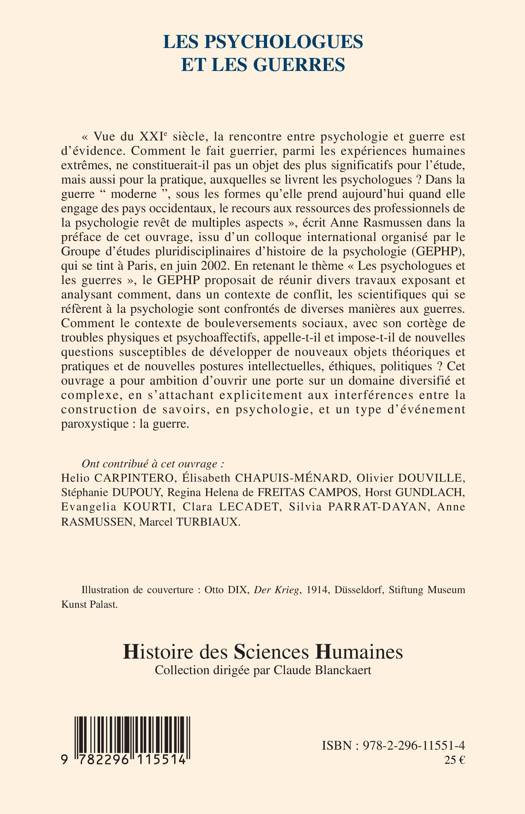 "Vue du XXIe siècle, la rencontre entre psychologie et guerre est d'évidence." Cet ouvrage réunit divers travaux exposant et analysant comment, dans un contexte de conflit, les scientifiques qui se réfèrent à la psychologie sont confrontés de diverses manières aux guerres. Ce livre a pour ambition d'ouvrir une porte sur un domaine diversifié et complexe, en s'attachant explicitement aux interférences entre la construction de savoirs, en psychologie, et un type d'événement paroxystique : la guerre.