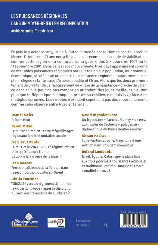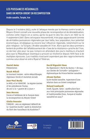 Depuis le 7 octobre 2023, suite à l'attaque menée par le Hamas contre Israël, le Moyen-Orient connaît une nouvelle phase de recomposition et de déstabilisation, comme cette région en a connu après la guerre des Six Jours en 1967 ou le 11 septembre 2001. Dans cet espace mouvementé, trois pays apparaissent comme de véritables puissances régionales par leur taille, leur population, leur potentiel économique, stratégique ou encore leur influence régionale, notamment sur le plan religieux: la Turquie, l'Arabie saoudite et l'Iran. Alors que les deux premiers tentent de profiter de l'affaiblissement de l'axe de la résistance proche de l'Iran, ce dernier plie pour ne pas rompre en attendant des jours meilleurs d'autant plus que la République islamique a prouvé sa résilience depuis 1979 face à de multiples épreuves. Les rivalités n'excluent cependant pas des rapprochements comme celui observé entre Ryad et Téhéran.